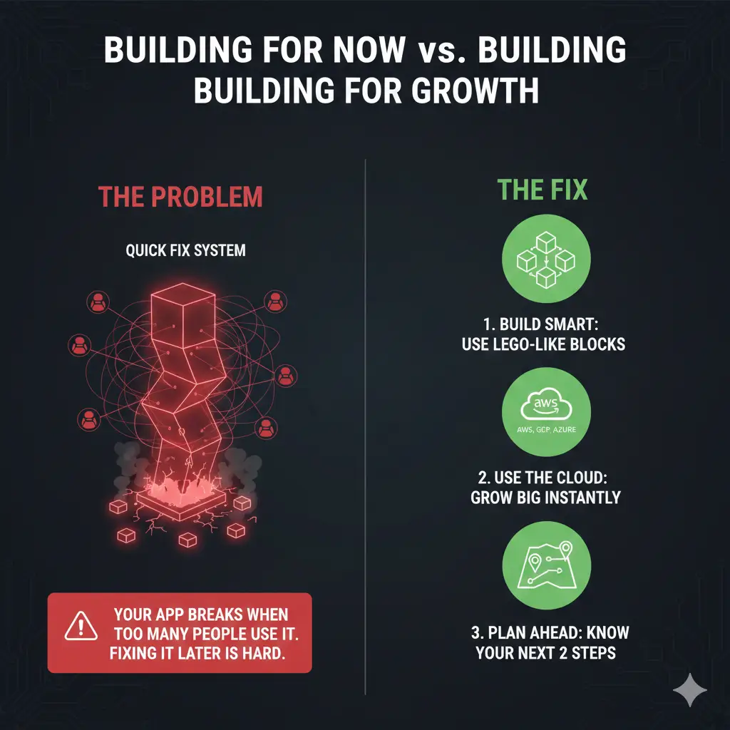 In the early sprint, every decision is a short-term gamble to hit the next milestone. This agility is necessary, but it creates a debt that comes due when you scale. Systems built on an MVP foundation collapse when user load multiplies overnight. Without a clear path to $100M-scale architecture, you will be forced to replatform under immense pressure.