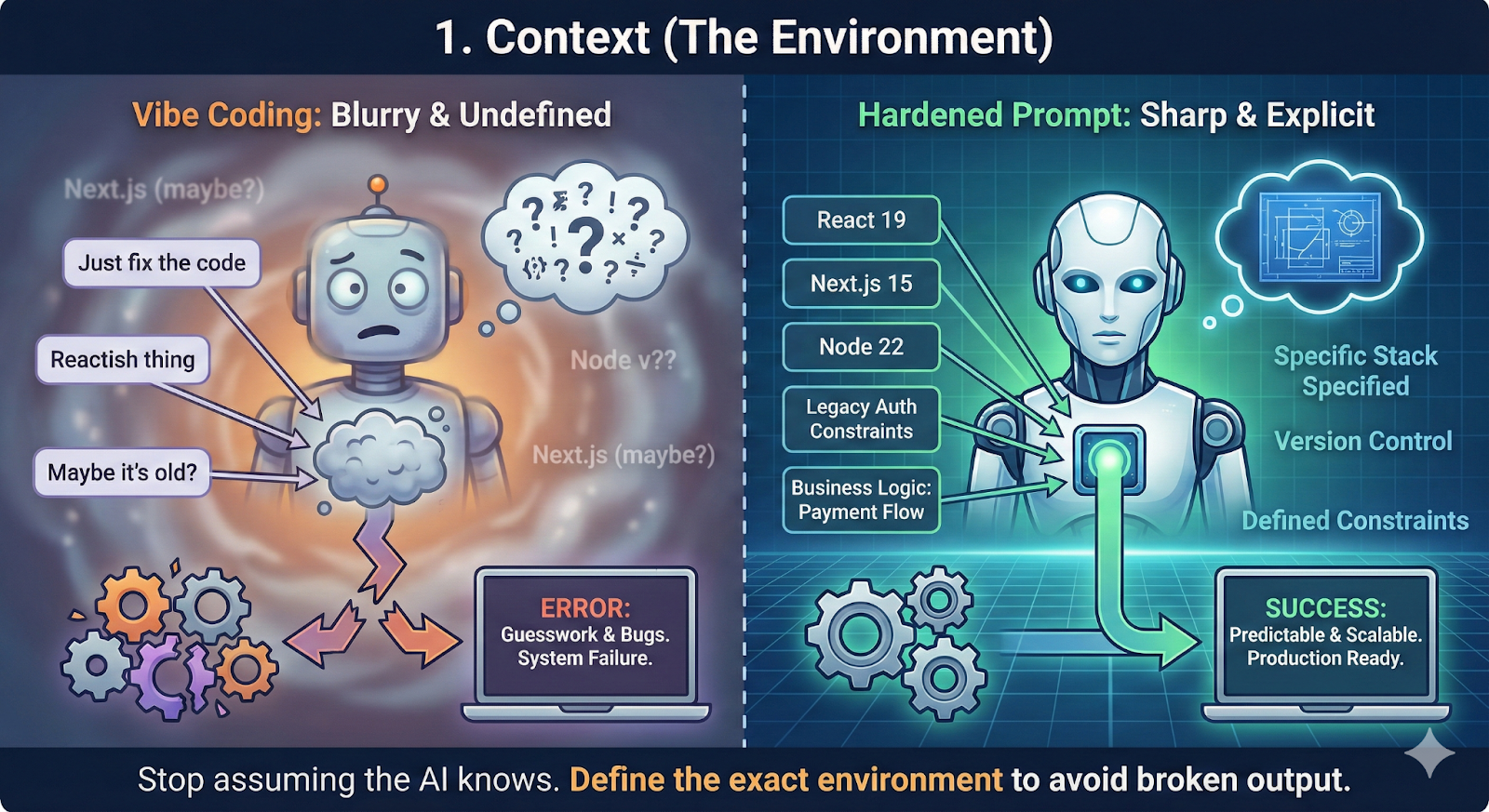 Stop assuming the AI knows your stack. Specify the exact versions such as React 19, Next.js 15, or Node 22. Mention the specific business logic or legacy constraints you are navigating. If you do not define the environment, the AI will guess, and usually it guesses wrong.