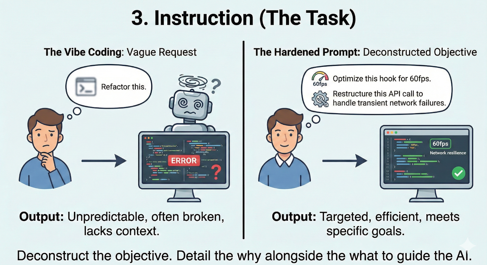 Deconstruct the objective. Do not just ask to "refactor this." Ask it to "optimize this hook for 60fps" or "restructure this API call to handle transient network failures." Detail the why alongside the what.