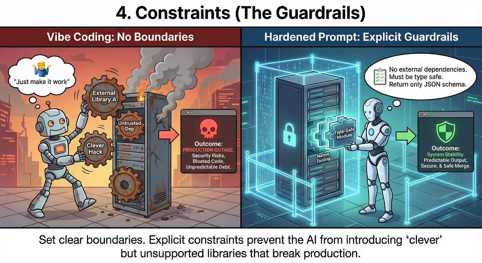 This is where you prevent production outages. Be explicit about your requirements: "No external dependencies," "Must be type safe," or "Return only the JSON schema." Clear boundaries prevent the AI from introducing "clever" libraries that your team does not actually need or support.