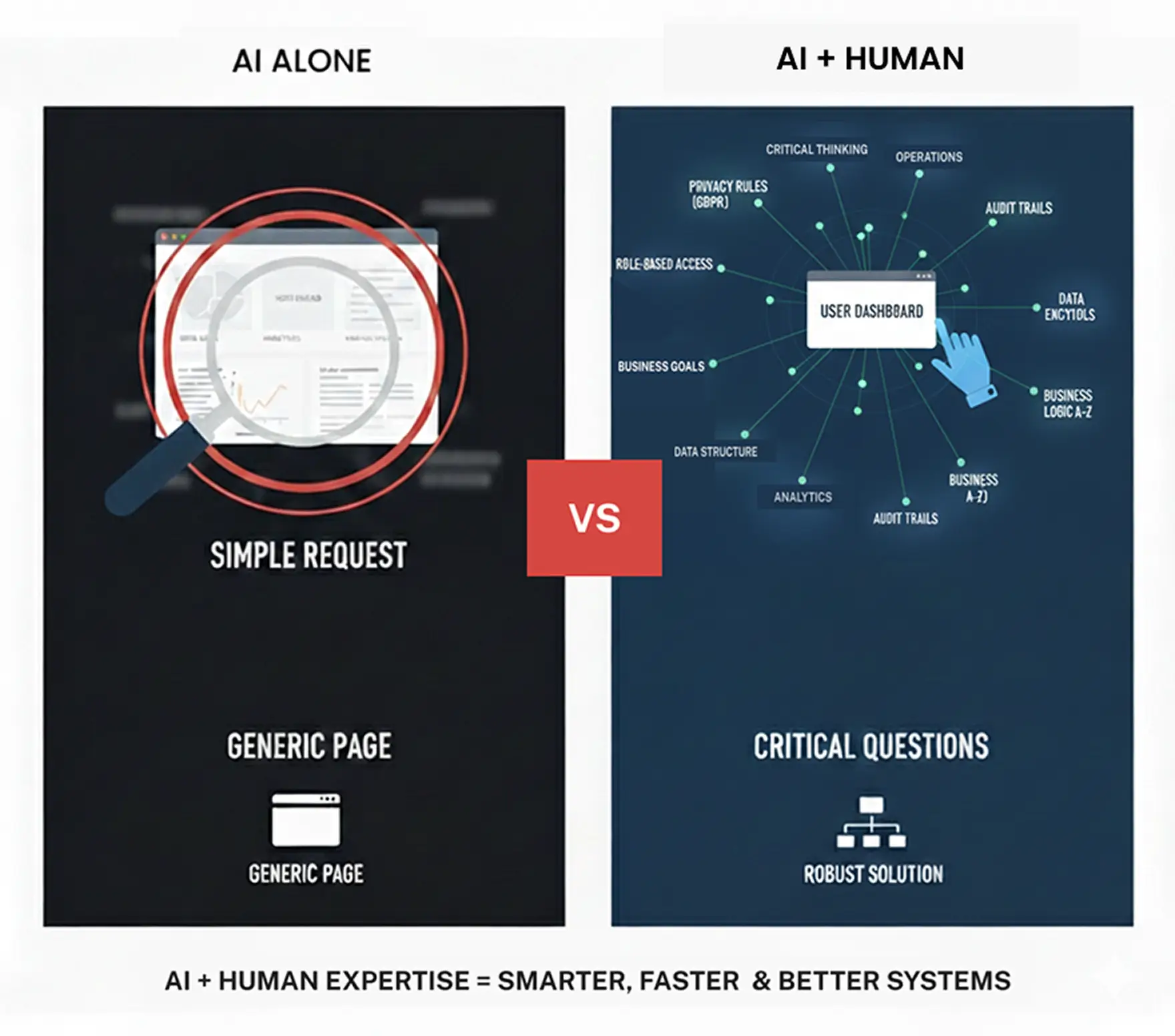 A client might say "We need a user dashboard." To an AI, that is a simple request for a page with some graphs. But to a senior engineer, that request is actually a web of 50 different business rules regarding privacy and data access. We know how to ask the questions the AI cannot.